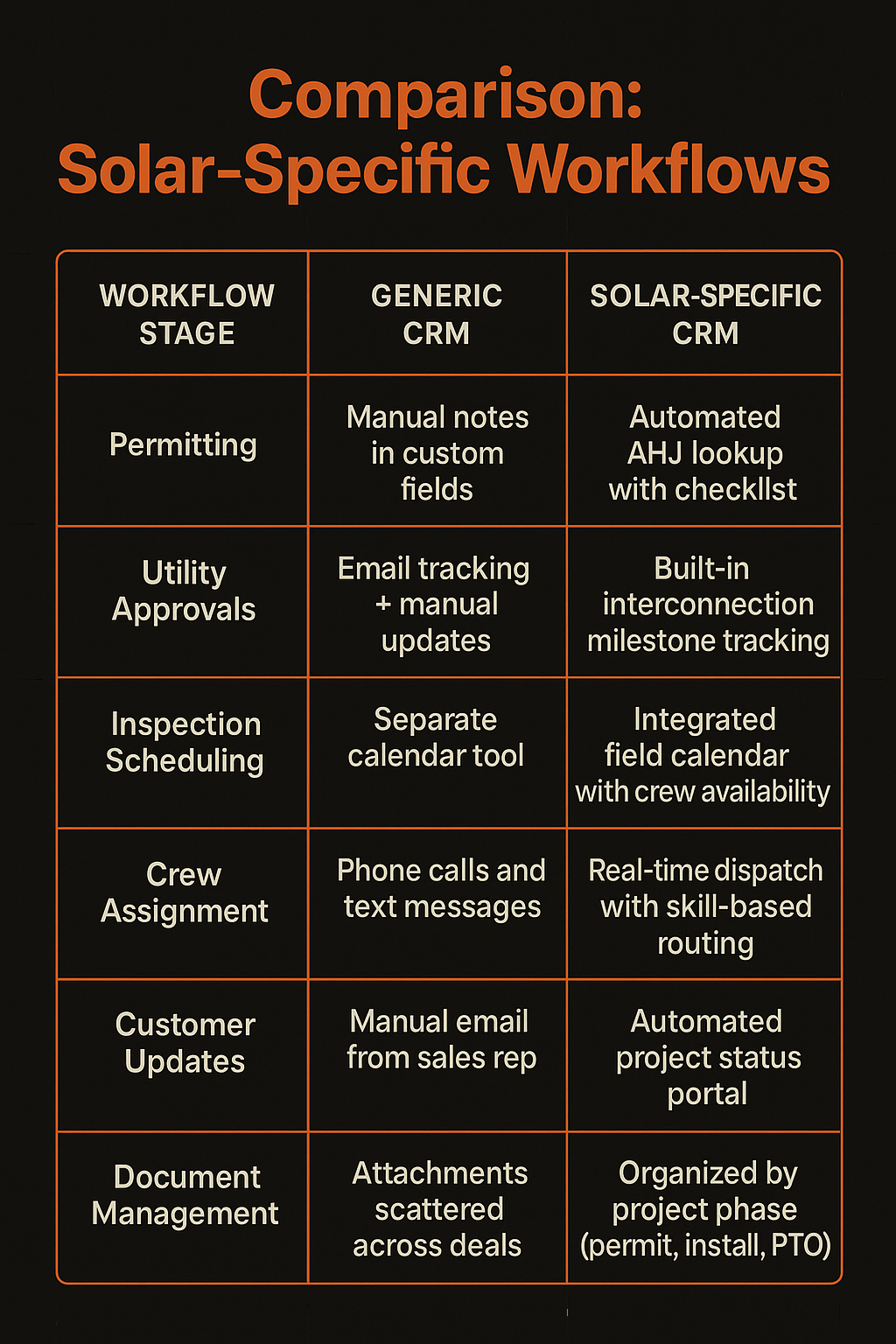 Meanwhile, a purpose-built CRM for solar installers includes all of these workflows out of the box. No customization. No consultant. No waiting.